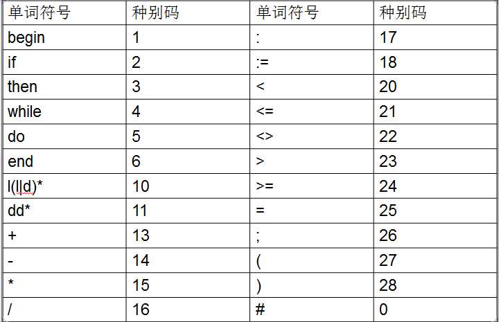#include <stdio.h> #include <string.h> #include <conio.h> #include <ctype.h> char prog[80]={‘\0‘},token[8]; char ch; int syn,n,sum,m,p; char *rwtab[6]={"begin","if","then","while","do","end"}; void scaner() { m=0; sum=0; for(n=0;n<8;n++) token[n]=‘\0‘; ch=prog[p++]; while(ch==‘ ‘) ch=prog[p++]; if(isalpha(ch)) { while(isalpha(ch)||isdigit(ch)) { token[m++]=ch; ch=prog[p++]; } token[m++]=‘\0‘; ch=prog[p--]; syn=10; for(n=0;n<6;n++) if(strcmp(token,rwtab[n])==0) { syn=n+1; break; } } else if(isdigit(ch)) { while(isdigit(ch)) { sum=sum*10+ch-‘0‘; ch=prog[p++]; } ch=prog[p--]; syn=11; } else switch(ch) { case‘<‘:m=0;token[m++]=ch;ch=prog[p++]; if(ch==‘>‘) { syn=21; token[m++]=ch; } else if(ch==‘=‘) { syn=22; token[m++]=ch; } else { syn=20; ch=prog[p--]; } break; case‘>‘:m=0;token[m++]=ch;ch=prog[p++]; if(ch==‘=‘) { syn=24; token[m++]=ch; } else { syn=23; ch=prog[p--]; } break; case‘:‘:m=0;token[m++]=ch;ch=prog[p++]; if(ch==‘=‘) { syn=18; token[m++]=ch; } else { syn=17; ch=prog[p--]; } break; case‘+‘:syn=13;token[0]=ch;break; case‘-‘:syn=14;token[0]=ch;break; case‘*‘:syn=15;token[0]=ch;break; case‘/‘:syn=16;token[0]=ch;break; case‘=‘:syn=25;token[0]=ch;break; case‘;‘:syn=26;token[0]=ch;break; case‘(‘:syn=27;token[0]=ch;break; case‘)‘:syn=28;token[0]=ch;break; case‘#‘:syn=0;token[0]=ch;break; default:syn=-1; } } main() { p=0; printf("\n请输入需要分析的字符串,以#表示结束:"); do { ch=getchar(); prog[p++]=ch; }while(ch!=‘#‘); p=0; do { scaner(); switch(syn) { case 11: printf("(%d,%d)\n",syn,sum);break; case -1: printf("\n 出错;\n");break; default: printf("(%d,%s)\n",syn,token); } }while(syn!=0); getch(); }