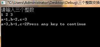 1.读入三个整数给a,b,c,然后交换它们中的数,把a中原来的值给b,把b中原来的值给c,把c中原来的值给a,最后输出a,b,c的值。
