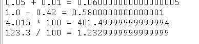 1 public class TestDouble { 2 3 public static void main(String args[]) { 4 System.out.println("0.05 + 0.01 = " + (0.05 + 0.01)); 5 System.out.println("1.0 - 0.42 = " + (1.0 - 0.42)); 6 System.out.println("4.015 * 100 = " + (4.015 * 100)); 7 System.out.println("123.3 / 100 = " + (123.3 / 100)); 8 } 9 }