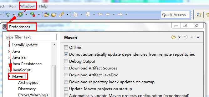 然后启动eclipse,在Window-->Prefrence窗口看到Maven的选项说明maven插件安装成功。