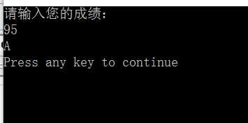 #include <stdio.h> #include <stdlib.h> int main() { int a,b; printf ("请输入您的成绩:\n"); scanf("%d",&a); b=a/10; if(a>100||a<0) { printf("输入错误!\n"); exit(0); } else { switch(b) { case 10:printf("A\n"); break; case 9: printf("A\n"); break; case 8: printf("B\n"); break; case 7: printf("C\n"); break; case 6:printf("D\n"); break; default :printf("E\n"); } } return 0; }