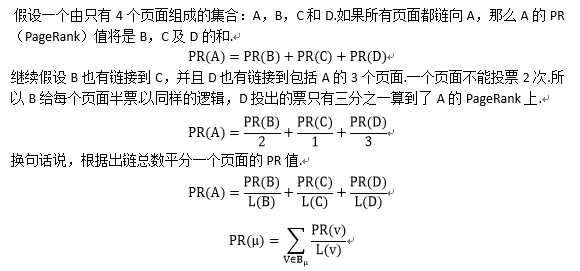 PageRank,网页排名,又称网页级别、Google左侧排名或佩奇排名,是一种由根据网页之间相互的超链接计算的技术,而作为网页排名的要素之一. Google用它来体现网页的相关性和重要性,在搜索引擎优化操作中是经常被用来评估网页优化的成效因素之一.PageRank适用于任何图或网络在任何域.因此,PageRank是现在经常使用在文献计量学,社会和信息网络分析,用于链接预测和推荐,甚至用于道路网络的系统分析,以及生物学,化学,神经科学,物理.