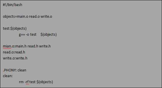 现在,我们有一个C++的项目需要进行编译,项目包含3个头文件,3个.cpp文件,分别是main.cpp,main.h,read.cpp,read.h,write.cpp,write.h,下面就是我们的Makefile了: