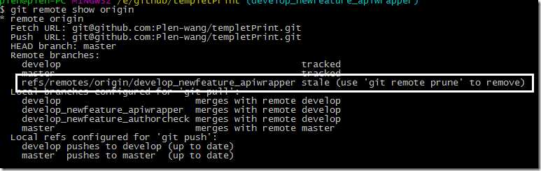 提示你可以通过git remote prune 移除这个分支。(也就是说你可以刷新本地仓库与远程仓库的保持这些改动的同步)