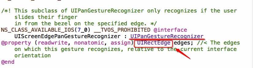 可见 UIScreenEdgePanGestureRecognizer是继承于 UIPanGestureRecognizer,而且edges这个属性我们也可以确认就是用来控制边缘。那我们可以尝试直接点击进去,看看是否可以直接修改系统的东西实现我们的需求。
