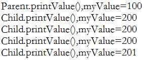 public class ParentChildTest { public static void main(String[] args) { Parent parent=new Parent(); parent.printValue(); Child child=new Child(); child.printValue(); parent=child; parent.printValue(); parent.myValue++; parent.printValue(); ((Child)parent).myValue++; parent.printValue(); } } class Parent{ public int myValue=100; public void printValue() { System.out.println("Parent.printValue(),myValue="+myValue); } } class Child extends Parent{ public int myValue=200; public void printValue() { System.out.println("Child.printValue(),myValue="+myValue); } }