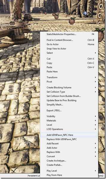 一旦在内容浏览器的Actor列表标签中选中了该actor,那么您现在就可以在游戏视口中右击来弹出关联菜单。在关联菜单中,选择菜单项 Add UDN_PawnNPC Here(在这里添加UDN_PawnNPC) 。