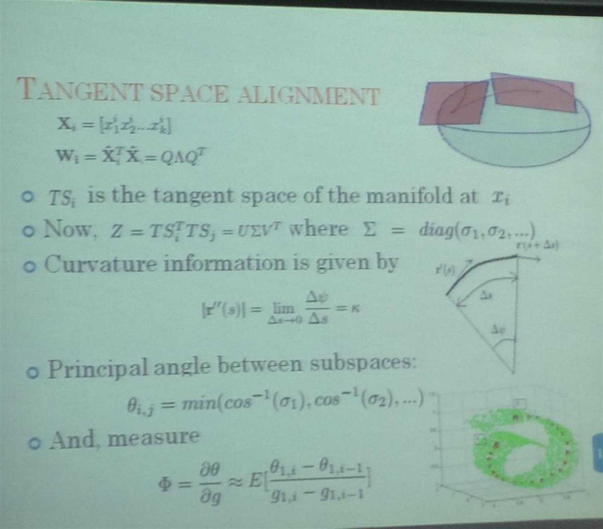 这涉及到微分几何里面的流行曲面。以人脸识别为例,一个人的各种表情,比如哭,笑,这些照片在多维空间里就组合成一个流行曲面,这是距离就不能用欧几何来算了。比如,从成都到北京,欧几何就是两点之间的距离,穿过地球,但是这时的距离应该是沿着地球表面经过的距离。