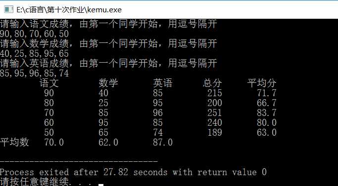 #include <stdio.h> int main() { int k[5][3],z[5],i,x,m,n,y=0; float p1[5],p2[3]; printf("请输入语文成绩,由第一个同学开始,用逗号隔开\n"); scanf("%d,%d,%d,%d,%d",&k[0][0],&k[1][0],&k[2][0],&k[3][0],&k[4][0]); printf("请输入数学成绩,由第一个同学开始,用逗号隔开\n"); scanf("%d,%d,%d,%d,%d",&k[0][1],&k[1][1],&k[2][1],&k[3][1],&k[4][1]); printf("请输入英语成绩,由第一个同学开始,用逗号隔开\n"); scanf("%d,%d,%d,%d,%d",&k[0][2],&k[1][2],&k[2][2],&k[3][2],&k[4][2]); for(i=0;i<=4;i++) { z[i]=k[i][0]+k[i][1]+k[i][2]; p1[i]=z[i]/3.0; } for(x=0;x<=2;x++) { p2[x]=(k[0][x]+k[1][x]+k[2][x]+k[3][x]+k[4][x])/5.0; } printf(" 语文 数学 英语 总分 平均分\n"); for(m=0;m<=4;m++) { for(n=0;n<=2;n++) { printf(" %2d",k[m][n]); } printf(" %2d %.1f\n",z[m],p1[m]); } printf("平均数 %.1f %.1f %.1f\n",p2[0],p2[1],p2[2]); return 0; }