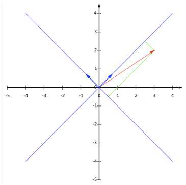 在二维空间中,一般情况下我们是以(0,1)和(1,0)作为一组基的,但同时(1,1)和(-1,1)也可以成为一组基。一般来说,我们希望基的模是1,因为从内积的意义可以看到,如果基的模是1,那么就可以方便的用向量点乘基而直接获得其在新基上的坐标了!因此将其单位化上面的基可以变为和。现在,我们想获得(3,2)在新基上的坐标,即在两个方向上的投影矢量值,那么根据内积的几何意义,我们只要分别计算(3,2)和两个基的内积,不难得到新的坐标为。下图给出了新的基以及(3,2)在新基上坐标值的示意图:
