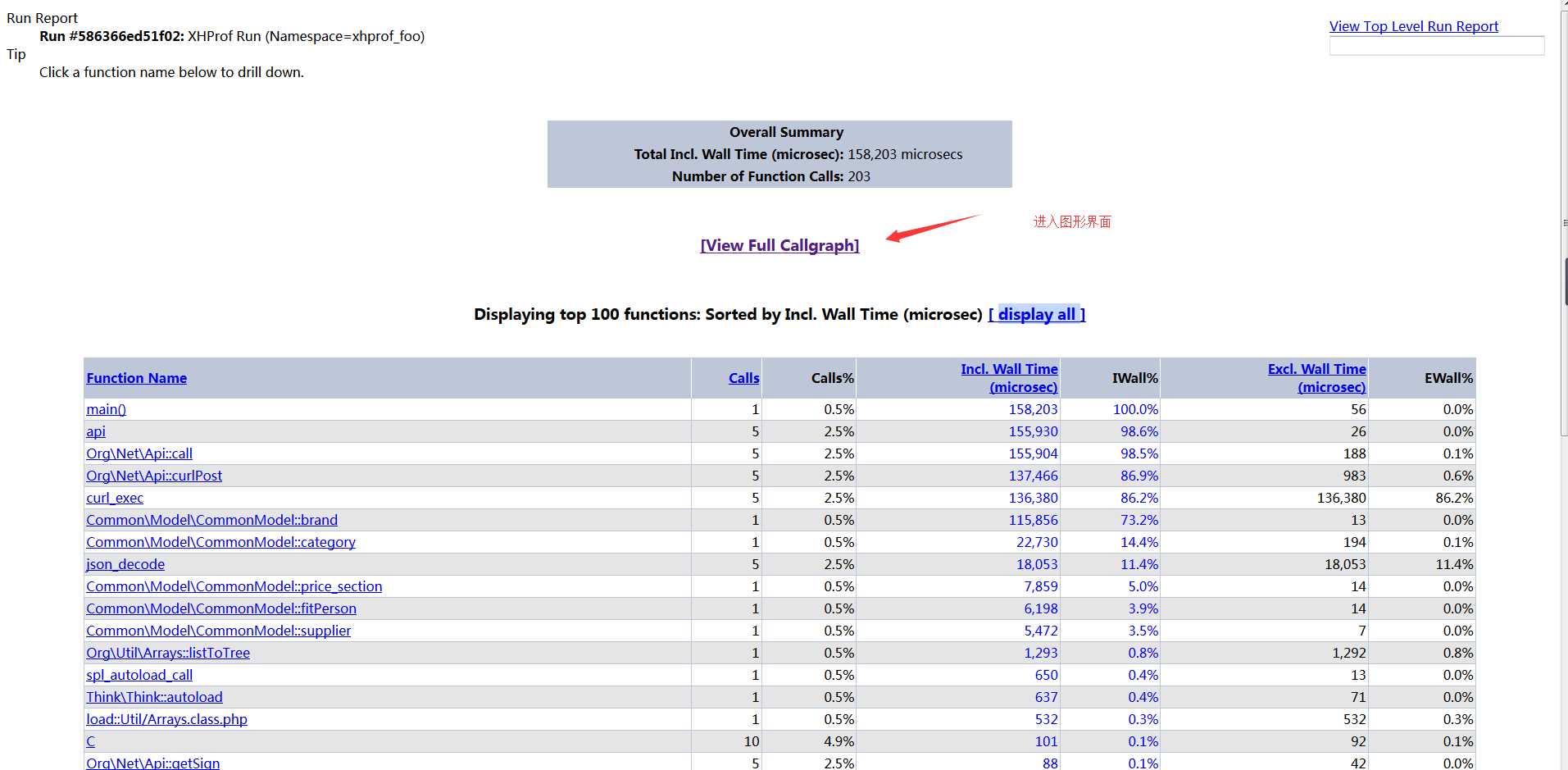 echo ‘<a href="http://xhprof.wst3.meici.com?run=‘ . $run_id . ‘&source=xhprof_foo" target="_blank">性能分析</a>‘;//输出地址,可以通过这个地址查看,也可自行配置