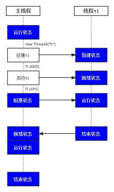 (01) 在“主线程main”中通过 new ThreadA("t1") 新建“线程t1”。 接着,通过 t1.start() 启动“线程t1”,并执行t1.join()。