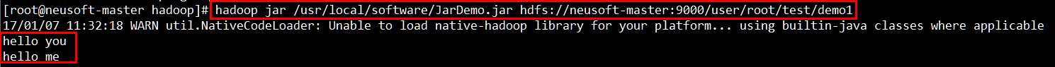 1 package Hdfs; 2 import java.io.InputStream; 3 import java.net.URL; 4 import org.apache.hadoop.fs.FsUrlStreamHandlerFactory; 5 import org.apache.hadoop.io.IOUtils; 6 7 public class JarDemo { 8 static{ 9 URL.setURLStreamHandlerFactory(new FsUrlStreamHandlerFactory()); 10 } 11 public static void main(String[] args) { 12 InputStream in =null; 13 try { 14 in= new URL(args[0]).openStream(); 15 IOUtils.copyBytes(in, System.out, 4096,false); 16 } catch (Exception e) { 17 e.printStackTrace(); 18 } finally{ 19 IOUtils.closeStream(in); 20 } 21 22 } 23 }