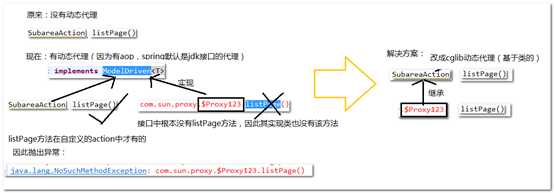 原因分析:Spring的动态代理优先对接口进行代理,默认的接口Action中只有execute方法,没有listpage()方法。