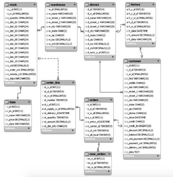 TPC-C用3NF(第三范式)虚拟实现了一家仓库销售供应商公司,拥有一批分布在不同地方的仓库和地区分公司。当公司业务扩大时,将建立新的仓库和地区分公司。通常每个仓库供货覆盖10家地区分公司,每个地区分公司服务3000名客户。该公司共有100 000种商品,分别储存在各个仓库中。该系统包含了库存管理、销售、分发产品、付款、订单查询等一系列操作,一共包含了9个基本关系,基本关系图如下图所示。