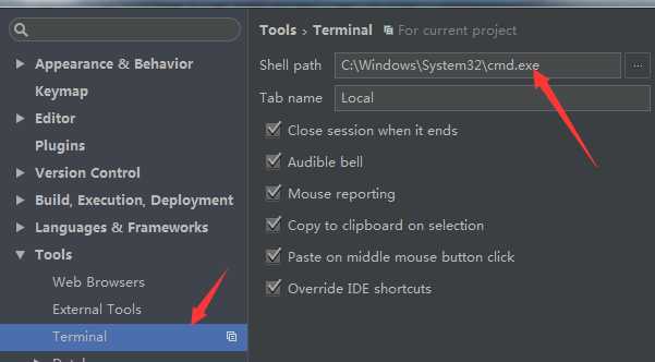 File——Setting——Tools——Terminal——Shell path中为cmd.exe路径,一般为C:\WINDOWS\system32目录下
