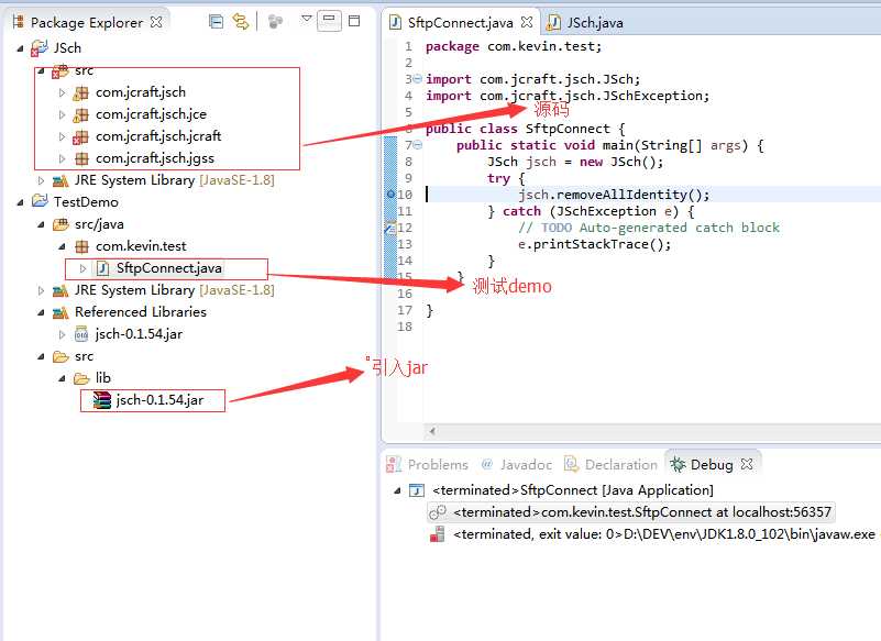 二、新建两个工程分别是JSch、TestDemo,JSch中引入jsch-0.1.54.jar的源码,项目结构如下图