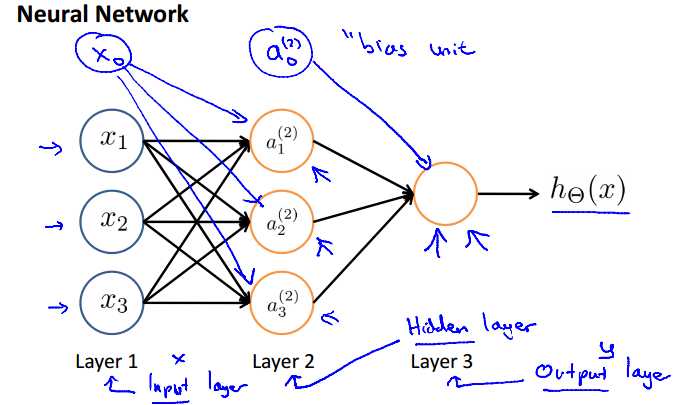 神经网络的简化形式如上图所示,x1,...xn为输入特征,输出为假设函数的结果。在模型中,通常会有一个额外的输入x0,我们称为"bias unit"(偏执单元),通常取值为1。