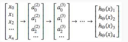 为了实现多元分类,需要假设函数返回一个向量值。如上面的例子,每个输出单元代表一个特定分类,每一个输出向量只有一个分量可以为1,值为1的分量代表特定的分类。