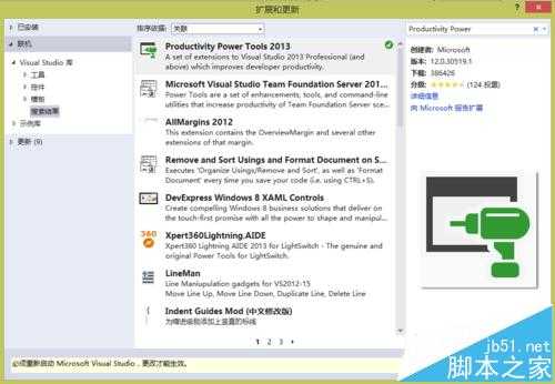 9、如果你想卸载它,依然是从顶部菜单选择“工具”——“扩展和更新”,在弹出的窗口中左侧选择“已安装”——“工具”,在右侧选中“Productivity Power Tools 2013”就可以执行提供的相应操作了。