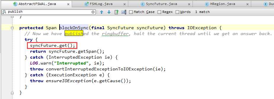 1. 从队列中获取一个由WAL日志消费线程提交的SyncFuture(下图红框中的代码)。