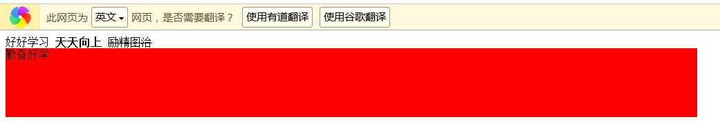 <!DOCTYPE html> <html lang="en"> <head> <meta charset="UTF-8"> <title>Document</title> <style type="text/css"> div { height: 100px; width: 1000px; background-color: red; /*使得div块变成行内元素*/ display:inline-block; } </style> </head> <body> <!--行内标签--> <span>好好学习</span> <strong>天天向上</strong> <s>励精图治</s> <!--块级标签--> <!--ul,ol,dl都是块级标签--> <div> 勤奋好学 </div> </body> </html>