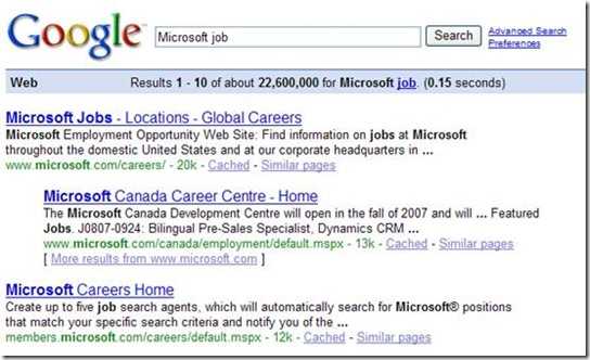 当然Google做的很不错,您一下就找到了jobs at Microsoft。想象一下,如果前几个全部是“Microsoft does a good job at software industry…”将是多么可怕的事情呀。