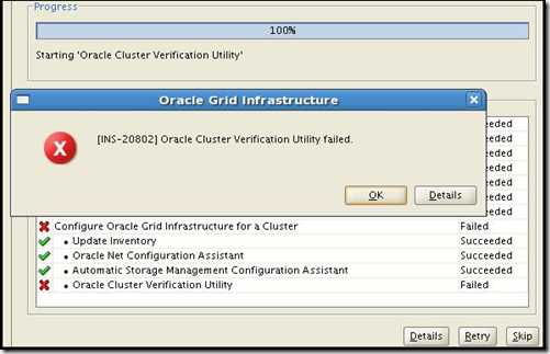 如果你没有dns的话,只用hosts文件,当然全部写到hosts里了,但scan-ip只能写一个。当然最后会报错,报INS-20802 Oracle Cluster Verfication Utility failed.再次当然,这个错误可以忽略的(因为你用hosts文件,scan-ip只有一个,如果用DNS的话就不会报错了【这是网上搜到的解释,第三次当然,我验证是错的】)。