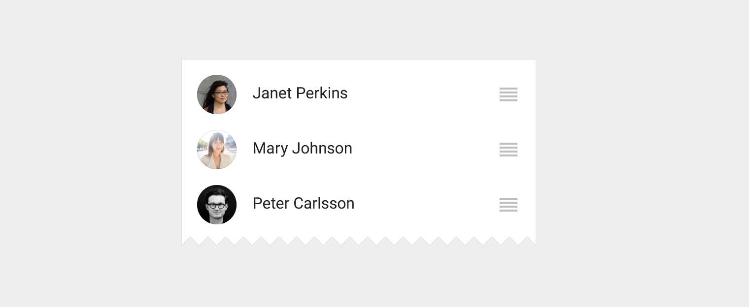 在设计一个支持"拖放"的列表时, 通常提供一个在触摸时初始化拖拽的"拖动手柄". 因其可发现性和可用性而被Material Guidelines所推荐, 尤其是列表处于"可编辑模式"时.