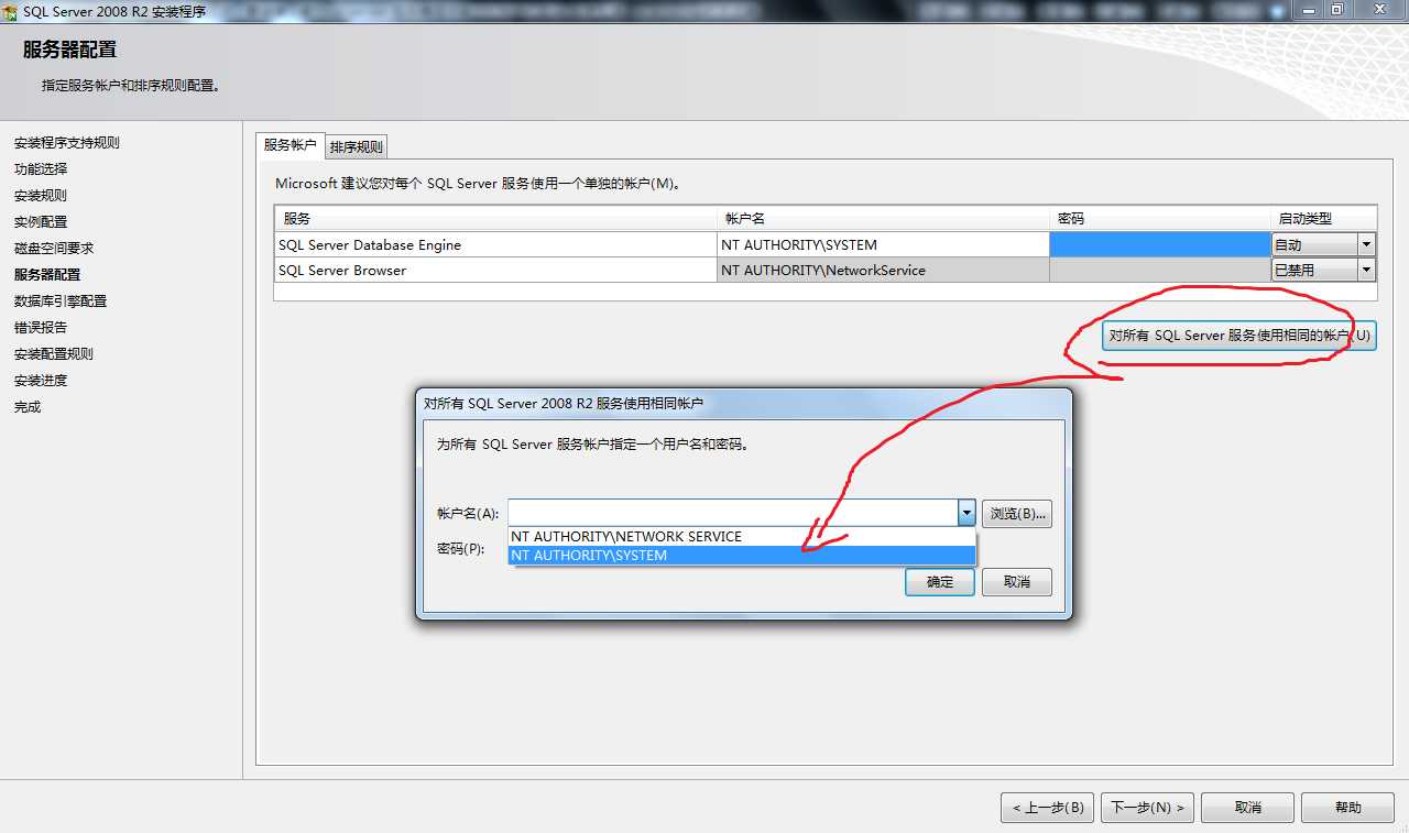 正确做法是:点击账户名右边的小三角,从下拉列表随便选一个("对所有SQL Server服务使用相同的账户"也一样)随便选一个账户,密码不用输即可。
