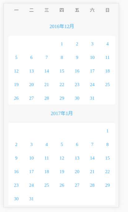 先说一下需求,日历页面中显示当前月份以及当前月份的前三个月,当前日期之前都可以点击,之后日期显示灰色不可点击状态;效果图如下: