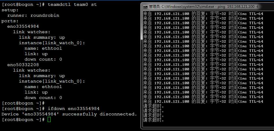 [root@bogon ~]# nmcli con sh NAME UUID TYPE DEVICE Wired connection 2 bf0cf9b6-c7fb-4c0a-ada4-abfb650dd5f0 802-3-ethernet -- Wired connection 1 5b4e0b3e-c469-404c-8839-76d18442fc20 802-3-ethernet -- eno16777736 100e462e-c0d0-4271-9b5a-1c8e47ff0d03 802-3-ethernet eno16777736 [root@bogon ~]# nmcli con del 5b4e0b3e-c469-404c-8839-76d18442fc20 bf0cf9b6-c7fb-4c0a-ada4-abfb650dd5f0 Connection ‘Wired connection 1‘ (5b4e0b3e-c469-404c-8839-76d18442fc20) successfully deleted. Connection ‘Wired connection 2‘ (bf0cf9b6-c7fb-4c0a-ada4-abfb650dd5f0) successfully deleted. [root@bogon ~]# nmcli con add type team ifname team0 con-name team0 config ‘{"runner":{"name":"roundrobin"}}‘ Connection ‘team0‘ (913f05c2-15d8-49a9-a35f-8bc5ee843c0c) successfully added. [root@bogon ~]# nmcli con add type team-slave ifname eno50332208 con-name team0-port2 master team0 Connection ‘team0-port2‘ (1583854c-1f85-4c76-8cc7-c643071d4b82) successfully added. [root@bogon ~]# nmcli con mod team0 ipv4.address "192.168.121.100/24" [root@bogon ~]# nmcli con mod team0 ipv4.method manual [root@bogon ~]# nmcli con sh NAME UUID TYPE DEVICE eno16777736 100e462e-c0d0-4271-9b5a-1c8e47ff0d03 802-3-ethernet eno16777736 team0-port2 1583854c-1f85-4c76-8cc7-c643071d4b82 802-3-ethernet -- team0-port1 bfd408b4-76d9-4f5c-ad5b-4d92430eb6ba 802-3-ethernet -- team0 913f05c2-15d8-49a9-a35f-8bc5ee843c0c team --