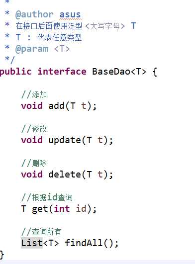 1 package org.dao; 2 3 import java.util.List; 4 5 public interface BaseDao<T> { 6 //修改 7 public void update(T t); 8 //添加 9 public void add(T t); 10 //删除 11 public void delete(T t); 12 //查找所有 13 public List<T> findAll(); 14 //根据id值 进行查找 一条记录 15 public T findOne(int id); 16 }