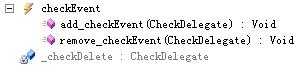可以看到显示声明事件的代码编译后和隐式声明事件的代码几乎相同,只不过这里我们自己定义了事件操作委托实例_checkDelete。另外显式声明的事件不支持直接调用,就算在定义事件的类里面也不能直接调用显式声明的事件(checkEvent();//这样会报错),应该调用事件委托实例(_checkDelete();)。