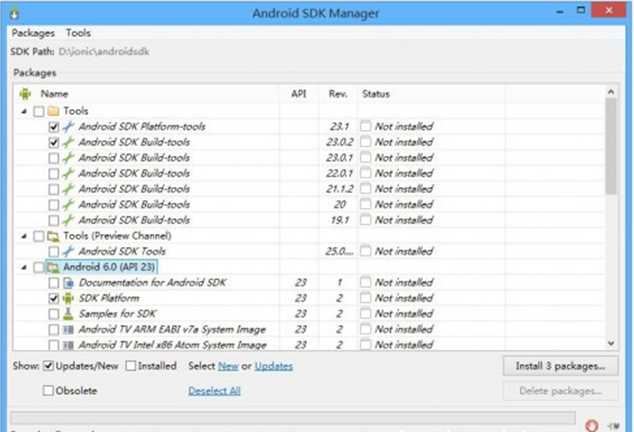 这里千万注意只需要勾选3个Android SDK Platform-tools、Android SDK Build-tools、API23下的SDK Platform (编译的时候会提示你需要的api版本,目前是API23)