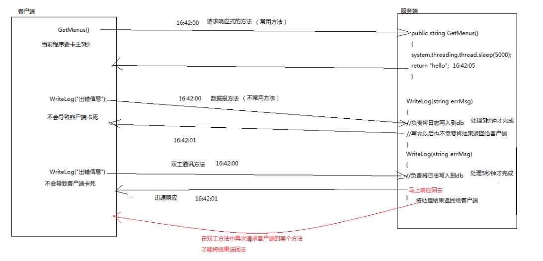1.正常模式:客户端调取接口-》等待服务响应-》接受响应-》执行客户端后面代码(wcf服务有入参,有返回值)