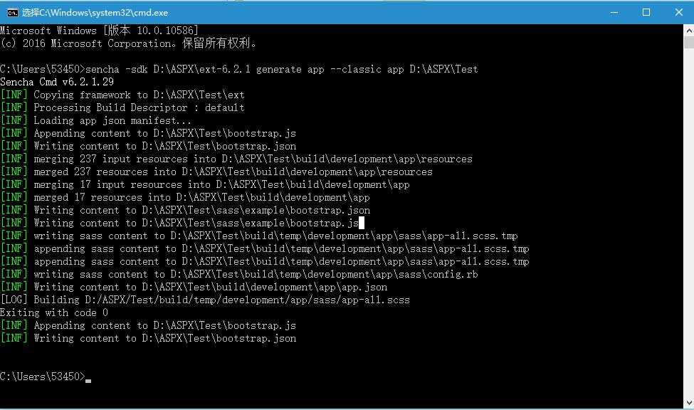 在命令行中输入sencha -sdk D:\ASPX\ext-6.2.1 generate app --classic app D:\ASPX\Test