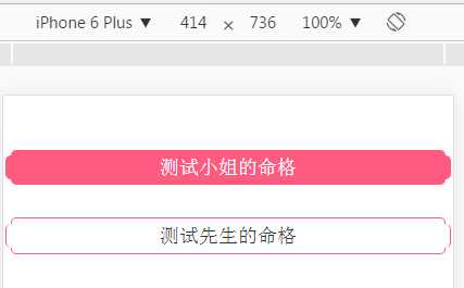 <!DOCTYPE html> <html lang="en"> <head> <meta charset="UTF-8"> <meta name="viewport" content="width=device-width,initial-scale=1.0, minimum-scale=1.0, maximum-scale=1.0, user-scalable=no" /> <meta content="yes" name="apple-mobile-web-app-capable" /> <meta content="black" name="apple-mobile-web-app-status-bar-style" /> <meta content="telephone=no" name="format-detection" /> <title>Document</title> <style type="text/css"> * {margin: 0;padding: 0;} body {max-width: 640px;margin: 50px auto;} .public_title { margin: 5px 2px;overflow: hidden; text-align: center; font-size: 16px;} .public_title .p_t_bottom, .public_title .p_t_top {height: 5px;margin: 0 5px;background: #ff5b80;} .public_title .p_t_top {border-radius: 5px 5px 0 0;} .public_title .p_t_body {height: 22px;line-height: 22px;background: #ff5b80;position: relative;font-size: 18px;border-radius: 5px;color: #fff;} .public_title .p_t_bottom {border-radius: 0 0 5px 5px;} .border_wrapper { margin: 30px 2px;overflow: hidden; text-align: center; font-size: 16px;} .border_wrapper .b_w_bottom, .border_wrapper .b_w_top {height: 5px;margin: 0 5px;border:1px solid #ff5b80;} .border_wrapper .b_w_top {border-radius: 5px 5px 0 0; border-bottom: 0;} .border_wrapper .b_w_body {height: 22px;line-height: 22px; border:1px solid #ff5b80;position: relative;font-size: 18px;border-radius: 5px;color: #333; border-top:0;border-bottom: 0} .border_wrapper .b_w_bottom {border-radius: 0 0 5px 5px;border-top:0;} </style> </head> <body> <div class="public_title"> <div class="p_t_top"></div> <div class="p_t_body"><span>测试小姐的命格</span></div> <div class="p_t_bottom"></div> </div> <div class="border_wrapper"> <div class="b_w_top"></div> <div class="b_w_body"><span>测试先生的命格</span></div> <div class="b_w_bottom"></div> </div> </body> </html>