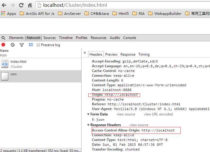 1 var xhr = new XMLHttpRequest(); 2 xhr.onload = function(){ 3 alert(xhr.responseText); 4 }; 5 xhr.open(‘POST‘, ‘http://localhost:8888/cors‘, true); 6 xhr.setRequestHeader("Content-Type", "text/html"); 7 xhr.send("f=json");
