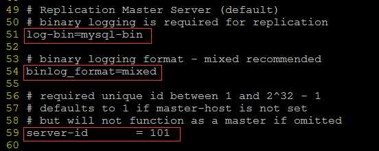 server-id=101 //为服务器设置一个独一无二的id便于区分,这里使用ip地址的最后一位充当server-id