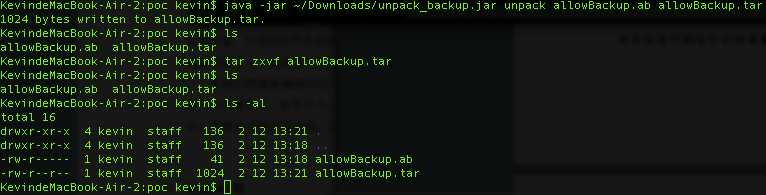 通过解密出备份的文件”allowBackup.ab”,通过如下图所示可得知该POC应用的备份的数据为空,因此备份不成功: