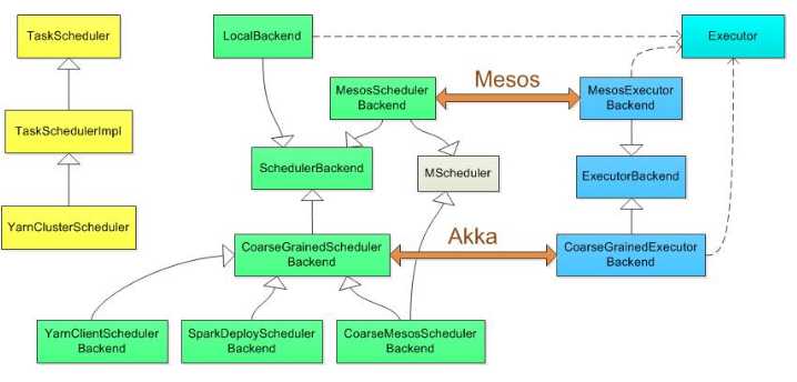 其中standalone是用SparkDeploySchedulerBackend配合TeskSchedulerImpl工作,相关类图应该是: