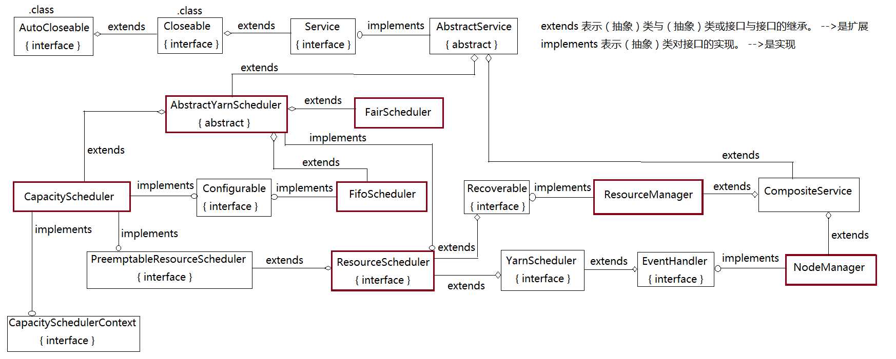 Hadoop2 调度框架:Hadoop的调度器是在ResourceManager中加载和调用的,用户可以在配置文件yarn-site.xml中的yarn.resourcemanager.scheduler.class属性中指定调度器,默认是 org.apache.hadoop.yarn.server.resourcemanager.scheduler.capacity.CapacityScheduler ; 还可以配置Fifo调度器,org.apache.hadoop.yarn.server.resourcemanager.scheduler.fifo.FifoScheduler ; 还可以配置Fair调度器, org.apache.hadoop.yarn.server.resourcemanager.scheduler.fair.FairScheduler 。 本节分析了Hadoop调度器的调度框架, 类比Hadoop1 , 三个调度器的共同扩展类是 AbstractYarnScheduler <T extends SchedulerApplicationAttempt, N extends SchedulerNode> , 它的功能类似Hadoop1的TaskScheduler ; 如果用户要编写自己的调度器,需要继承抽象类AbstractYarnScheduler。