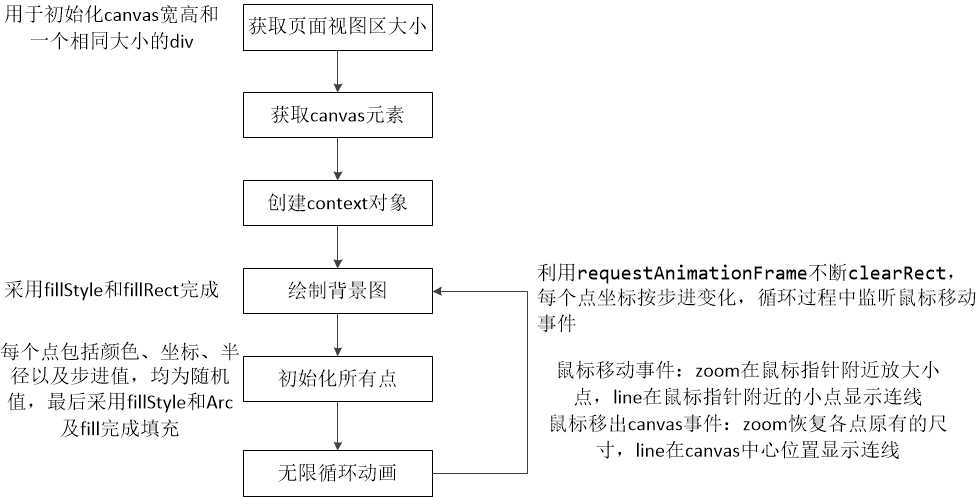 var p = this; p.originParams = originParams; p.params = params; p.innerWidth = window.innerWidth;//页面视图区大小 p.innerHeight = window.innerHeight; p.points = []; p.pageXY = {pageX:p.innerWidth/2,pageY:p.innerHeight/2}; if(container[0] === ‘#‘) { p.container = container.split(‘#‘)[1]; }; //获取canvas元素 p.canvas = document.getElementById(p.container); //创建context对象 p.ctx = p.canvas.getContext(‘2d‘); //初始化 p.init = function() { p.canvas.width = p.innerWidth; p.canvas.height = p.innerHeight; p.drawBackground(); p.addOverlap(); p.initDrawPoint(); p.animation(); p.mouseEvent(); p.windowResize(); }; p.addOverlap=function(){ p.overlap=document.createElement(‘div‘); p.overlap.style.width=p.innerWidth+‘px‘; p.overlap.style.height=p.innerHeight+‘px‘; p.overlap.style.position=‘absolute‘; p.overlap.style.top=‘0px‘; p.overlap.style.left=‘0px‘; p.overlap.style.zIndex=‘100‘; if(p.canvas.nextElementSibling){//?? p.canvas.parentNode.insertBefore(p.overlap,p.canvas.nextElementSibling);//insertBefore接收要插入的节点和作为参考的节点 }else{ p.canvas.parentNode.appendChild(p.overlap); }; }; //粒子颜色 p.color = function() { function random() { return Math.round(Math.random() * 255); }; this.r = random(); this.g = random(); this.b = random();//分别调用三次取随机值 this.a = random(1, 0.8); this.rgba = ‘rgba(‘ + this.r + ‘,‘ + this.g + ‘,‘ + this.b + ‘,‘ + this.a + ‘)‘; return this; }; //获取随机数 p.random = function(max, min) { var min = arguments[1] || 0; return Math.floor(Math.random() * (max - min + 1) + min); }; //绘制背景图 p.drawBackground = function() { if(!p.canvas) return; p.ctx.fillStyle = ‘#000‘; p.ctx.fillRect(0, 0, p.innerWidth, p.innerHeight); }; //粒子 p.point = function() {//每个粒子包括颜色,坐标、半径 this.color = new p.color(); this.x = Math.random() * p.innerWidth;//随机坐标 this.y = Math.random() * p.innerHeight; this.vx = p.random(10, -10) / 40;//步进,调用p.random this.vy = p.random(10, -10) / 40; this.r = p.random(3, 1);//半径,调用p.random,半径最大为3,最小为1,在这个范围内波动 this.scale = 1;//放大倍数 }; //初始化点 p.initDrawPoint = function() { for(var i = 0; i < p.params.point; i++) {//所有点 var point = new p.point(); p.points.push(point); p.ctx.beginPath(); p.ctx.fillStyle = point.color.rgba; p.ctx.arc(point.x, point.y, point.r * point.scale, 0, Math.PI * 2, true); p.ctx.fill(); }; p.ctx.closePath(); }; //点点连线 p.connect = function() { function lineColor(p1, p2) { var linear = p.ctx.createLinearGradient(p1.x, p1.y, p2.x, p2.y);//起点终点坐标 linear.addColorStop(0, p1.color.rgba);//开始的颜色 linear.addColorStop(1, p2.color.rgba);//结束的颜色 return linear; }; for(var i = 0; i < p.params.point; i++) { for(var j = 0; j < p.params.point; j++) { var p1 = p.points[i]; var p2 = p.points[j]; if(Math.abs(p2.x - p1.x) < p.params.minDis && Math.abs(p2.y - p1.y) < p.params.minDis) {//两点之间距离小于一定程度才连线 p.ctx.beginPath(); p.ctx.lineWidth = 0.2; p.ctx.strokeStyle = lineColor(p1, p2);//采用渐变,描边样式 p.ctx.moveTo(p1.x, p1.y); p.ctx.lineTo(p2.x, p2.y); p.ctx.stroke();//描边,使用的是strokeStyle p.ctx.closePath(); }; }; }; }; p.lineto = function() {//和鼠标位置有关 function isInView(point) { return Math.abs(point.x - p.pageXY.pageX) < p.params.mouseDis && Math.abs(point.y - p.pageXY.pageY) < p.params.mouseDis; }; (function line() { function lineColor(p1, p2) { var linear = p.ctx.createLinearGradient(p1.x, p1.y, p2.x, p2.y); linear.addColorStop(0, p1.color.rgba); linear.addColorStop(1, p2.color.rgba); return linear; }; for(var i = 0; i < p.params.point; i++) { for(var j = 0; j < p.params.point; j++) { if(i != j) { var p1 = p.points[i]; var p2 = p.points[j]; if(isInView(p1) && isInView(p2)) { if(Math.abs(p2.x - p1.x) < p.params.minDis && Math.abs(p2.y - p1.y) < p.params.minDis) { p.ctx.beginPath(); p.ctx.lineWidth = 0.2; p.ctx.strokeStyle = lineColor(p1, p2); p.ctx.moveTo(p1.x, p1.y); p.ctx.lineTo(p2.x, p2.y); p.ctx.stroke(); p.ctx.closePath(); }; }; }; }; }; })(); }; //无限循环动画 p.animation = function() { p.ctx.clearRect(0, 0, p.innerWidth, p.innerHeight); p.drawBackground(); for(var i = 0; i < p.params.point; i++) { var point = p.points[i]; if(point.x < 0 || point.x > p.innerWidth) {//当小圆球碰到矩形壁以后反弹 point.vx = -point.vx; }; if(point.y < 0 || point.y > p.innerHeight) { point.vy = -point.vy; }; p.ctx.beginPath(); p.ctx.fillStyle = point.color.rgba; point.x += point.vx; //小圆球不断移动 point.y += point.vy; p.ctx.arc(point.x, point.y, point.r * point.scale, 0, Math.PI * 2, true); p.ctx.fill(); }; if(p.params.effect == ‘zoom‘) { p.connect();//将小球与小球用线连接,鼠标移动事件定义在mouseEvent中 } else if(p.params.effect == ‘line‘) { p.lineto();//该函数与鼠标位置有关,通过鼠标事件传入鼠标位置,在该位置附近连线 }; requestAnimationFrame(p.animation); }; //鼠标事件 p.mouseEvent = function() { p.overlap.addEventListener(‘mousemove‘, function(e) {//鼠标指针移动时触发div中的事件 var e = e || window.event; var pageX = (e.clientX + document.body.scrollLeft || e.pageX) - this.offsetLeft;//offsetLeft指div到边框?? var pageY = (e.clientY + document.body.scrollTop || e.pageY) - this.offsetTop; if(p.params.effect == ‘zoom‘){ for(var t = 0; t < p.params.point; t++) { var point = p.points[t]; if(Math.abs(point.x - p.pageXY.pageX) < p.params.minDis && Math.abs(point.y - p.pageXY.pageY) < p.params.minDis) {//鼠标附近的点 point.scale = 5; } else { point.scale = 1; }; }; }; p.pageXY.pageX = pageX; p.pageXY.pageY = pageY; }); p.overlap.addEventListener(‘mouseout‘, function(e) {//鼠标指针位于一个元素上方,然后用户将其移入另一个元素时触发 if(p.params.effect == ‘zoom‘){//zoom鼠标移出div都变为原来的比