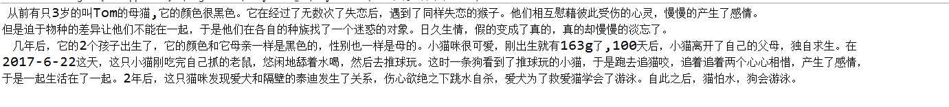 System.out.println("然后去推球玩。这时一条狗看到了推球玩的小猫,于是跑去追猫咬,追着追着两个心心相惜,产生了感情,");