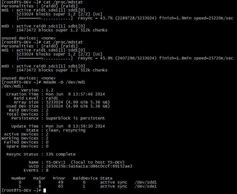 可以看到,raid1 正在创建,待创建完毕,状态如下: