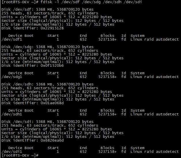 RAID5 至少需要三块硬盘,我们拿/dev/sdf, /dev/sdg, /dev/sdh, /dev/sdi 这四块硬盘来做实验,三块做为活动盘,另一块做为热备盘。
