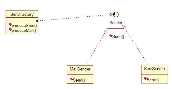 public class SendFactory { public Sender produceMail(){ return new MailSender(); } public Sender produceSms(){ return new SmsSender(); } }