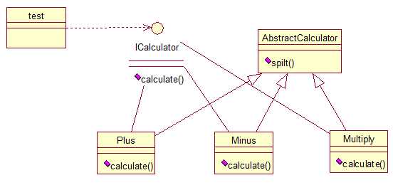 public class StrategyTest { public static void main(String[] args) { String exp = "8+8"; AbstractCalculator cal = new Plus(); int result = cal.calculate(exp, "\\+"); System.out.println(result); } }