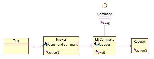 public interface Command { public void exe(); } public class MyCommand implements Command { private Receiver receiver; public MyCommand(Receiver receiver) { this.receiver = receiver; } @Override public void exe() { receiver.action(); } } public class Receiver { public void action(){ System.out.println("command received!"); } } public class Invoker { private Command command; public Invoker(Command command) { this.command = command; } public void action(){ command.exe(); } } public class Test { public static void main(String[] args) { Receiver receiver = new Receiver(); Command cmd = new MyCommand(receiver); Invoker invoker = new Invoker(cmd); invoker.action(); } } //输出:command received!